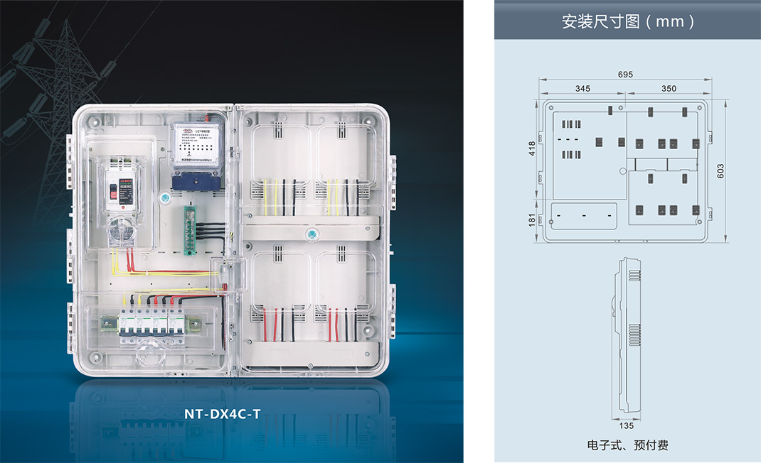 電表箱生產(chǎn)廠家-浙江南騰電氣有限公司研發(fā)的NT系列透明塑料電表箱,采用進口聚碳酸酯(PC)和阻燃ABS工程塑料制成。具有抗沖擊、抗老化、耐腐蝕、透明度高、抗紫外線、安裝方便等優(yōu)點,并且具有用電安全保護,用戶分離控制,數(shù)據(jù)采集, 防盜電等功能。產(chǎn)品適合安裝電子式、機械式、智能IC卡預(yù)付式、智能多費率式電表。南騰NT系列透明塑料電表箱自推出市場以來,憑借其完美的設(shè)計理念,在電表箱行業(yè)遙遙領(lǐng)先。