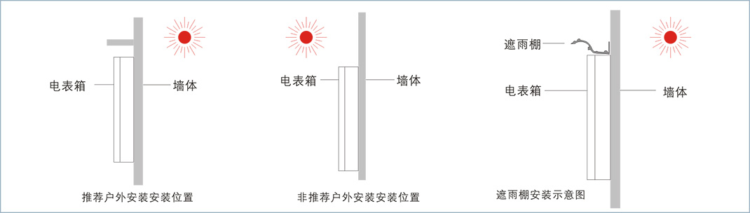 ●如果電表箱戶外安裝時處于非推薦安裝位置,請在安裝好電表箱后,再安裝廠家推薦安裝的戶外專用安裝附件組合式遮雨棚。